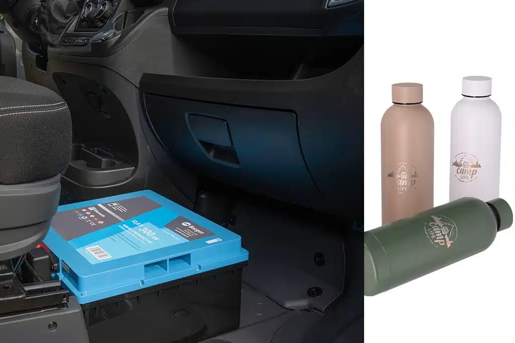 Die Berger LiFePO4 Lithium Untersitz Batterie Pro hat eine Kapazität von 300 Amperestunden und einen Entladestrom von 250 Ampere. Rechts im Bild: die neuen Edelstahl-Trinkflaschen der Marke Camplife.