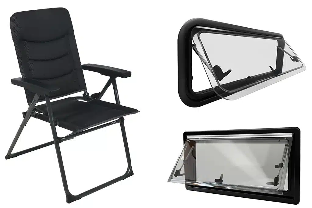 Der Klappstuhl Vaneo punktet mit kleinem Packmaß und geringem Gewicht. Die Seitenfenster Vision (oben) und View gibt es in zahlreichen Größen, Vision ist speziell für Kastenwagen mit abgerundeter Bauweise konzipiert.