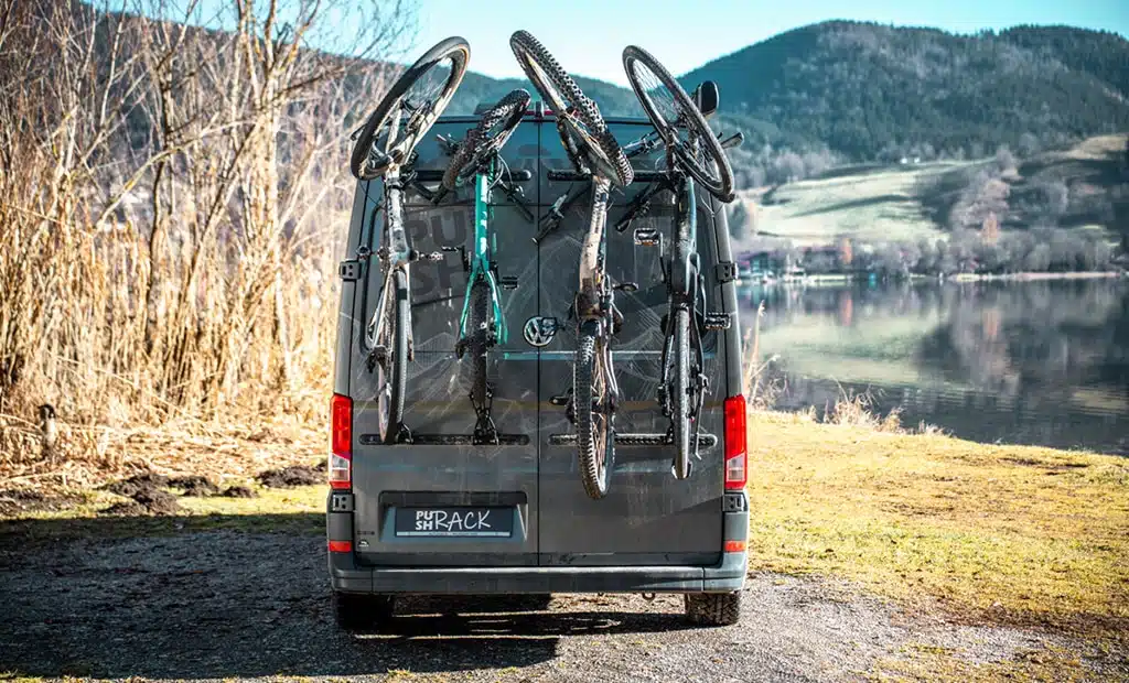 Mit dem modularen Hecksystem PUSHrack V3 der Firma PUSH components lassen sich bis zu vier Fahrräder transportieren und sogar offroad-tauglich sichern.