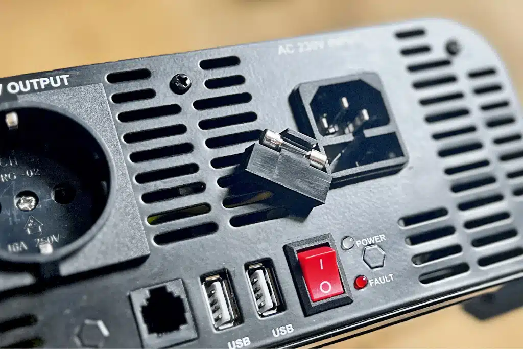 Relevante Fakten 2.000 Watt Dauerlast problemlos mit 63,4 dB sehr laut 25-mm2-Batteriekabel im Lieferumfang zu dünn (>100 °C im Test) AC-In-Absicherung für mitgeliefertes Kabel zu hoch (10 vs. 15 A), zudem ist eine besonders träge Sicherung verbaut, die die Auslösung verzögert sehr simples Bedienteil (An/Aus) ohne Zusatzfunktionen und Infos 2 USB-Ports am Gehäuse, nicht BUS-fähig keine Isolierung für montierte Batteriekabel