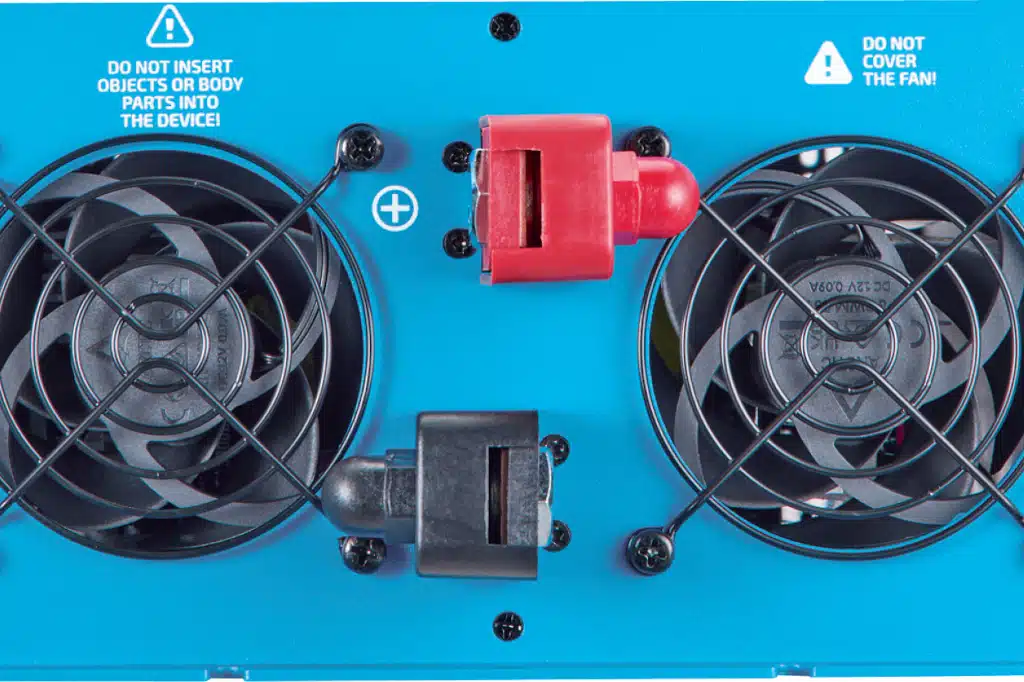 Mit 5,1 Kilogramm liegt der Dometic im Mittelfeld. Der mitgelieferte C13-Stecker darf 16 A, Batteriekabel lassen sich mit M8-Ringösen montieren. Sinnlos: Die Kabelanschlüsse am Gerät verfügen über Gewinde, obwohl die M8-Schrauben mit Federring und Mutter gekontert werden. Eher kontraproduktiv. Sehr gut: Die Anschlüsse sind mit den Kunststoffkappen schnell und sicher isoliert. 2.000 Watt Dauerbetrieb absolviert der SinePower problemlos, auch 2.400 Watt für drei Minuten stellt ihn vor keine Herausforderung. Die Lüfter starten leise bei kleinen Verbrauchern und regeln entsprechend der Belastung hoch. Das Lüftergeräusch ist vergleichsweise angenehm, auch bei Dauerlast meist um die 58 dB – ein sehr guter Wert.