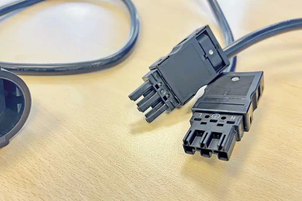 Parallel packt tHE zwei Kabel mit WAGO-Winsta-Stecker (Anschluss 230 Volt im Fahrzeug und Schuko-Steckdose) mit eindeutiger Zuordnung der L-Phase und N-Neutralleiter im 230-Volt-Netz zum Gerät. Die Stecker rasten sicher am Gerät ein. Volle 16 Ampere sind damit möglich und abgesichert (andere Geräte limitieren beim Durchschalten von Landstrom). Sollte der tHE die Funktion einstellen, steckt man beide Winsta-Stecker für AC-IN und AC-OUT zusammen, um die Versorgung der verbauten Steckdosen über Landstrom zu garantieren. Sehr gut: der integrierte RCD Typ B. Als einziger RCD (FI) löst er sogar bei einem Gleichstromfehler im Gerät aus.