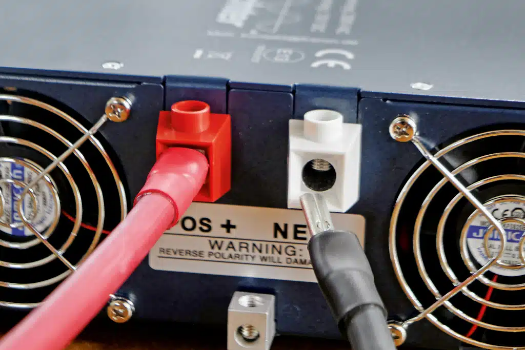 Nicht optimal: Die Batteriekabeln (25 mm2, 815 mm lang) sind für ein Gerät dieser Leistung zu dünn, für die 10-mm-Kabelaufnahme am Wechselrichter wären 10-mm-Ringösen optimal, Teleco crimpt Ösen mit 12-mm-Loch auf die Kabel. Auch nicht optimal: Die 10er-Batteriekabelschrauben für Plus/Minus liegen unten offen (keine Isolierung). Hier sollte man nachisolieren, um einen Kurzschluss zu vermeiden.