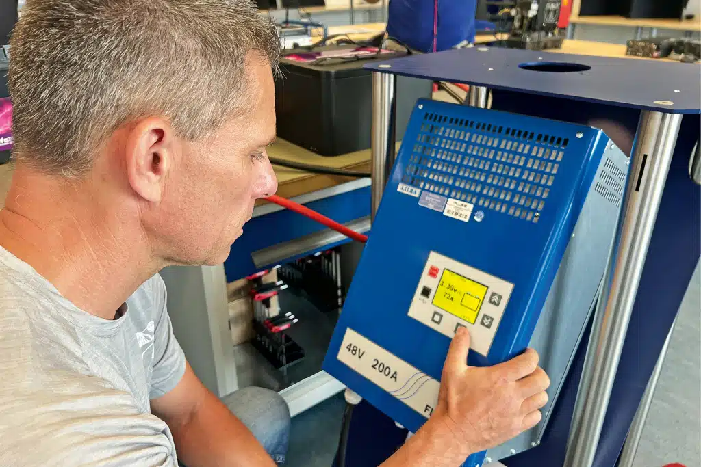 Die serienmäßige Fernbedienung aus Metall ist insgesamt zwar recht simpel, aber immerhin lässt sich das Gerät damit an- und ausschalten und der Nutzer erhält eine sichtbare Fehlermeldung bei Überlast oder Überhitzung (ohne Ton an FB). Auf die Enden der Battreie-Kabel crimpt der Elektronikfachhandel Fraron in der eigenen Kabelwerkstatt Stiftkabelschuhe für den Anschluss an den Wechselrichter.