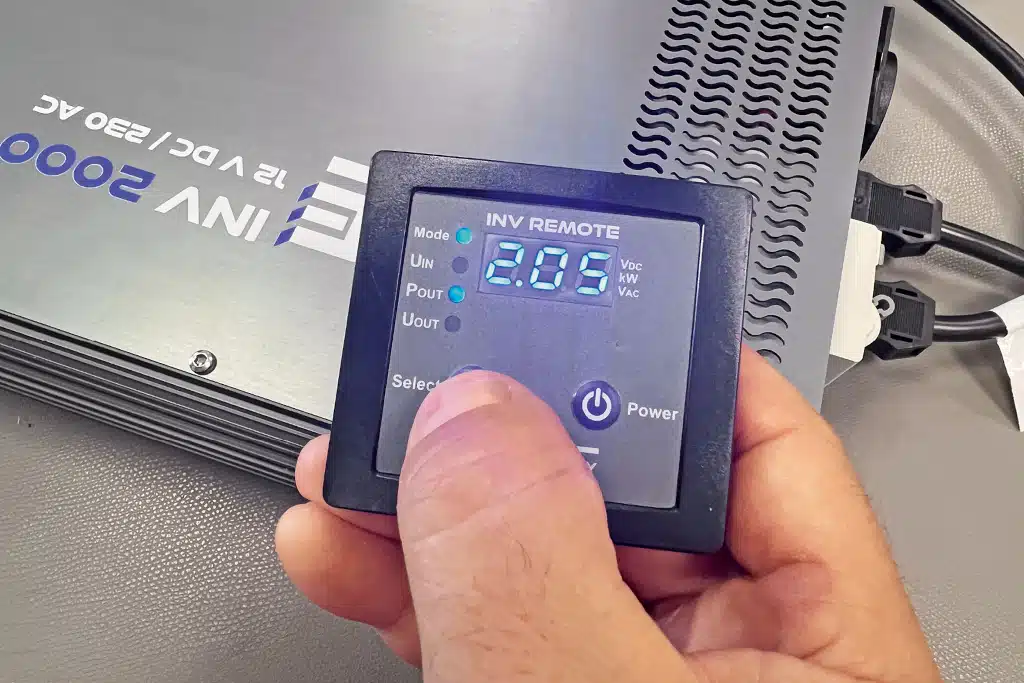 Das serienmäßige externe Display (Fernbedienung) und die Tasten am Gerät sind gleichberechtigt. Nutzer können also an beiden an- und ausschalten. Wahlweise. Die Fernbedienung informiert über die aktuell entnommene Leistung, aktiviert den Power-Saving-, sprich Standby-Modus, dessen Schwellen programmierbar sind. Man könnte, wenn man wollte, die USV-Funktion, die unterbrechungsfreie Stromversorgung, individuell programmieren. Soll der Inverter automatisch anspringen, wenn Landstrom ausfällt? Machbar oder deaktivierbar.