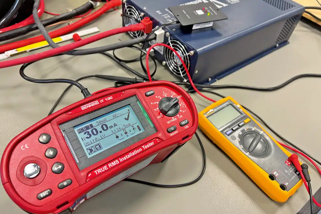 Testergebnisse: Stromverbrauch Leerlaufstrom/Standby: 1,15 A / – Nennleistung im Dauerlasttest: 2.000 W / 15 min problemlos Überlasttest: bei 2.100 Abschaltung Wirkungsgrad bei 800 W: >90 % Lautstärke: 49,9 dB Umschaltzeit Netzvorrang/Fi: 28,4 ms* / 24,7 ms (bei 30 mA) * wenn Landstrom ausfällt und Wechselrichter automatisch übernimmt