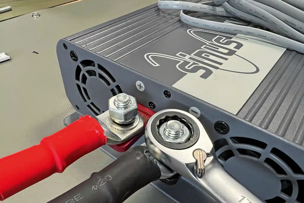 Mit Blick auf die sehr gute Höchstleistung des TI: Bei 2.400 Watt rauschen 210 Ampere durch die Batteriekabel. Schon bei der Nennleistung sind es 160 A. Auch hier sollte mindestens ein 50-mm2-Kabel montiert sein.