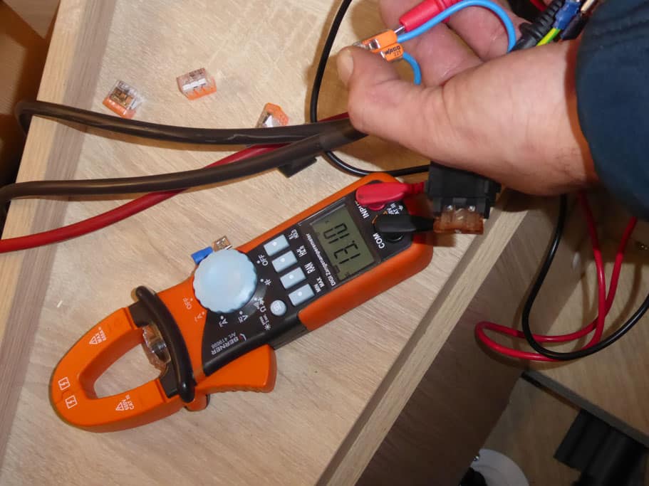 Dann beginnt die Verkabelung. Das Multimeter zeigt an, ob Strom fließt und der Schalter funktioniert. Hinter ihm ist zur Sicherheit eine Sicherung platziert. Wago-Klemmen erleichtern den Anschluss.