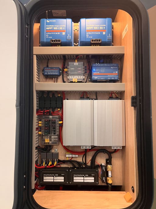 Burow baut den Trek5 absolut winterfest mit frostsicheren, beheizten Tanks. 225 Liter Frisch- und 110-Liter-Abwasser können befüllt werden. Im Grund-Setup sind 200-Ah-LiFEPO4-Batterien, ein 90-Liter-Kompressorkühlschrank, und ein zweiflammiges Induktionskochfeld im gasfreien Camper an Bord.