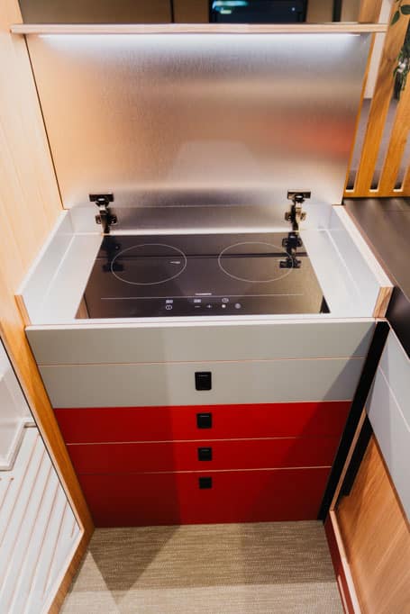 Das Bad ist mit Aluminium-Oberfläche ausgekleidet, der Zugang zum Heckbett gelingt über eine ausziehbare Schublade samt Schwerlastschienen (untererste Schublade im Küchenblock). Hierfür muss der Decke vom Induktionskochfeld runtergeklappt werden.