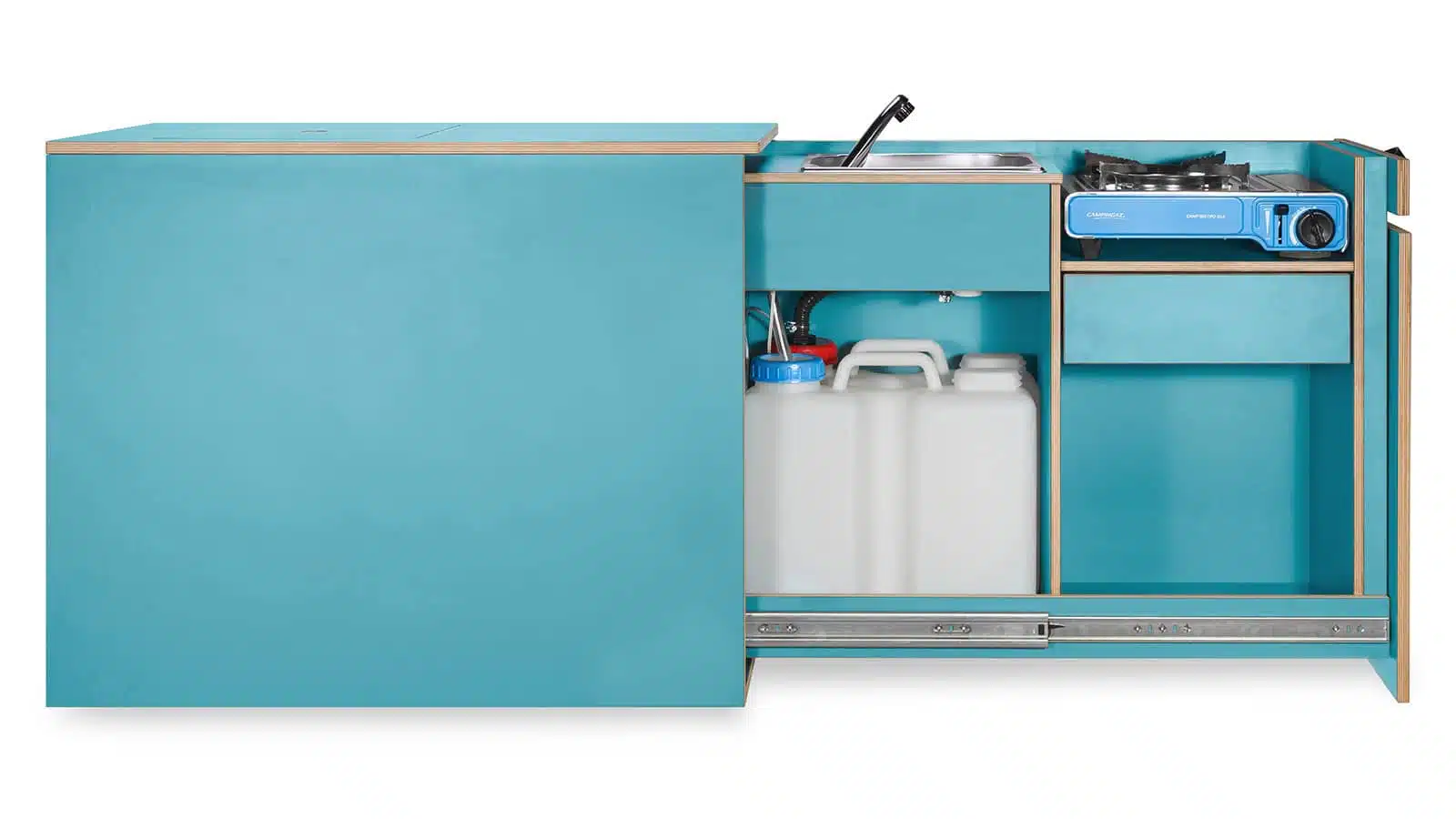 Das Vanside-Küchenmodul hört auf den Namen Hedi. Von der Kochstelle über die Wassereinheit bis zur ausklappbaren Arbeitsplatte und großzügigem Stauraum unterhalb der Kochstelle ist alles vorhanden. Zusätzlich kann sie ausgezogen werden, um in optimaler Arbeitshöhe draußen kochen zu können. Waschbecken und Kocher sind aber auch im eingefahrenen Zustand nutzbar. Das Modul misst 391 x 719 x 914 Millimeter und kostet inklusive Geräte 1.590 Euro.
