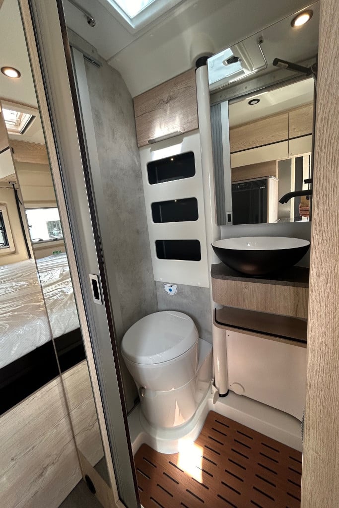 Das Bad ist mit Dreh-WC, Schwenkwaschbecken und vollwertiger Dusche komplett ausgestattet. Innenraum und Warmwasser temperiert eine Dieselheizung Truma Combi 4D.