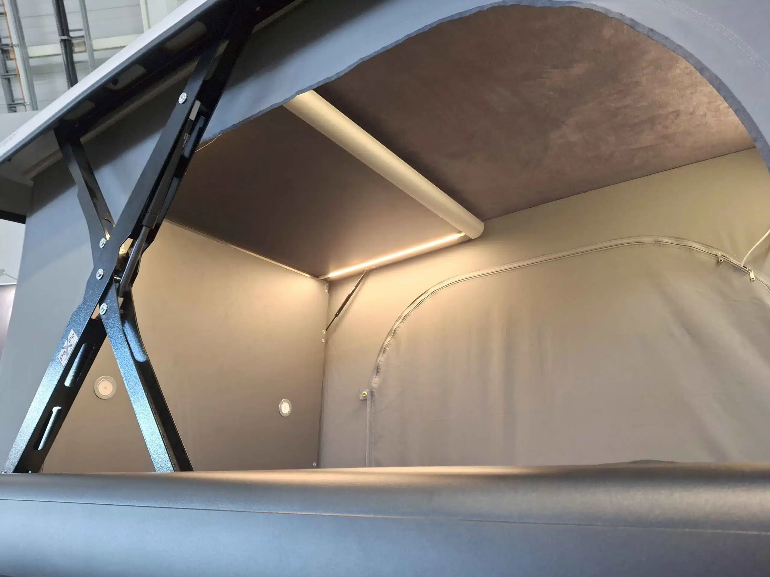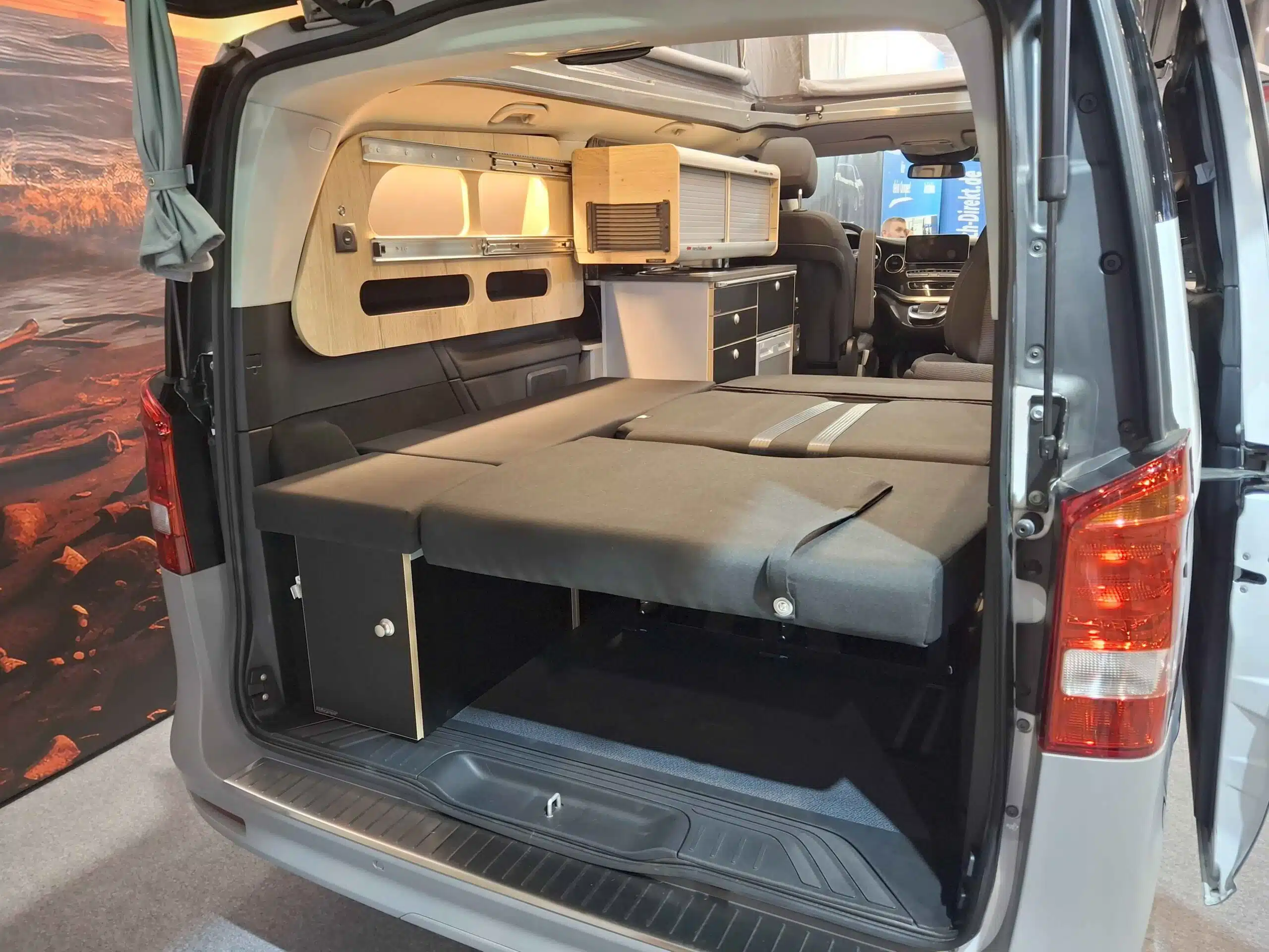 Das Dach lässt sich ganz einfach elektrisch über eine Fernbedienung ein- und ausfahren, die Schlaffläche im Schlafdach beträgt 190 mal 116 Zentimeter. Ausgestattet ist das Bett mit 3,5 Zentimeter hohen Froli-Tellerfedern und einer 3,5 Zentimeter dicken Matratze. Der Zeltstoff ist aus einem Baumwollmischgewebe gefertigt, seitlich finden Camper Fenster mit Moskitonetzen und Verdunkelung, vorne und hinten mit Folie. Die Dachschale ist flach konstruiert, sodass die Fahrzeughöhe mit geschlossenem Dach unter der Zwei-Meter-Marke (198 cm) bleibt, die für viele Tiefgaragen oder Strände in Frankreich und Spanien relevant ist. Ab Werk ist sie im typischen Polarweiß von Mercedes-Benz lackiert, eine Individualfarbe kostet rund 1.000 Euro Aufpreis. Wenn das Basisfahrzeug über einen Klimahimmel verfügt, bleibt dessen Funktion erhalten, die Luftmenge ist aber etwas reduziert.