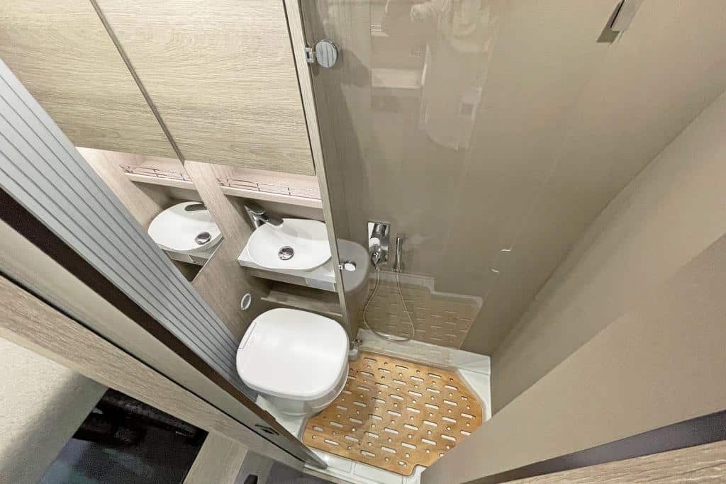 Ansonsten gibt es ein Längsbad, dessen Dusche mit einer Plexiglasscheibe abgetrennt werden kann, und eine Küche mit hochgesetztem Kühlschrank.