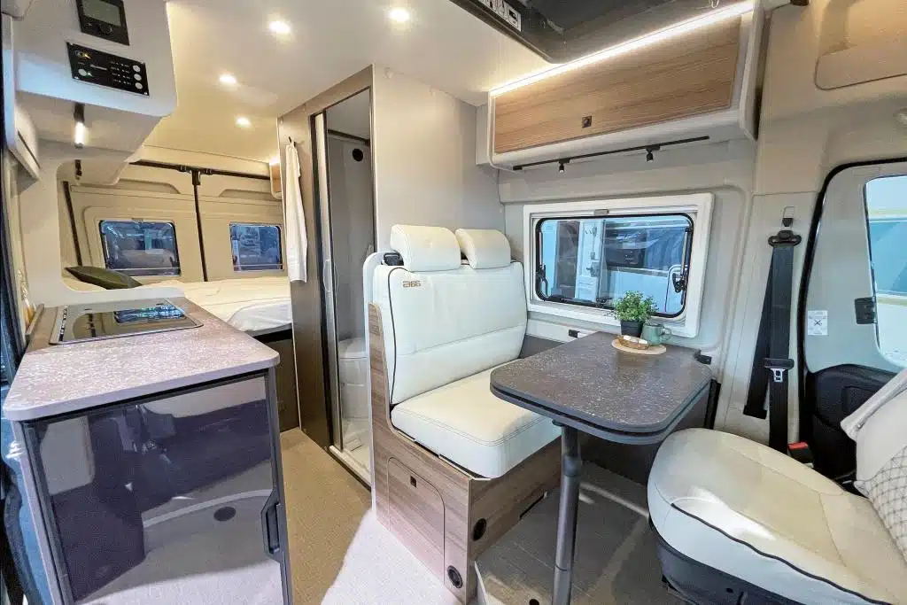 Der Campeo-Grundriss wurde nur im Detail überarbeitet: Halbdinette vorn, Querbett hinten, in der Fahrzeugmitte die Längsküche – und neu ein komfortables Schwenkbad.