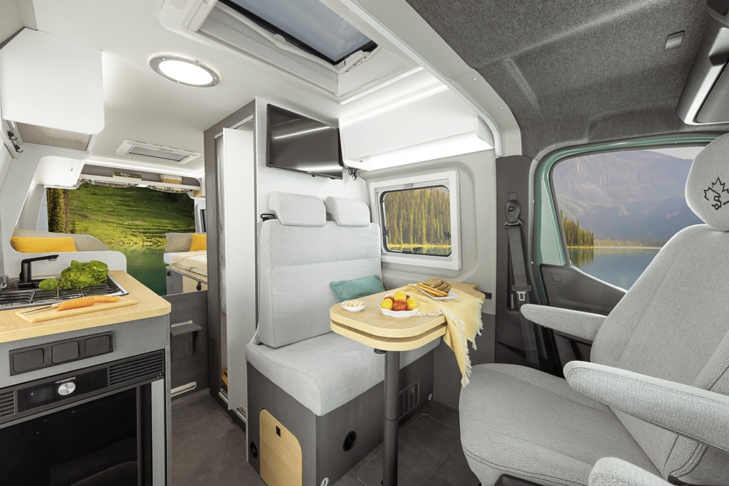 Beide Grundrisse verfügen außerdem über umlaufende Dachstauschränke – auch über dem Fahrerhaus. Im Bereich der Schiebetür steht jeweils ein Küchenblock mit stirnseitig verbautem Dometic-Kühlschrank, der sich mit seiner doppelt angeschlagenen Tür bequem von innen und außen erreichen lässt. Die Kocher-Spüle-Kombination kommt von CAN. Gegenüber ist das Kompaktbad mit einer platzsparenden Falttür, einem Eckwaschbecken und einer Kassettentoilette ausgestattet. Das Rahmenfenster gehört zur Serienausstattung, der Holzeinleger zum 1.490 Euro teuren Comfort-Paket.