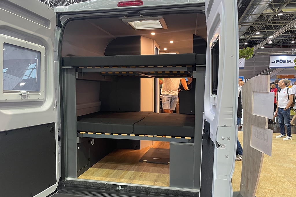 Die Pössl-Group-Tochter präsentiert den neuen Stockbetten-Grundriss auf 5,99 Meter langen Citroën Jumper mit Werkshochdach (H2, 2,64 Meter).