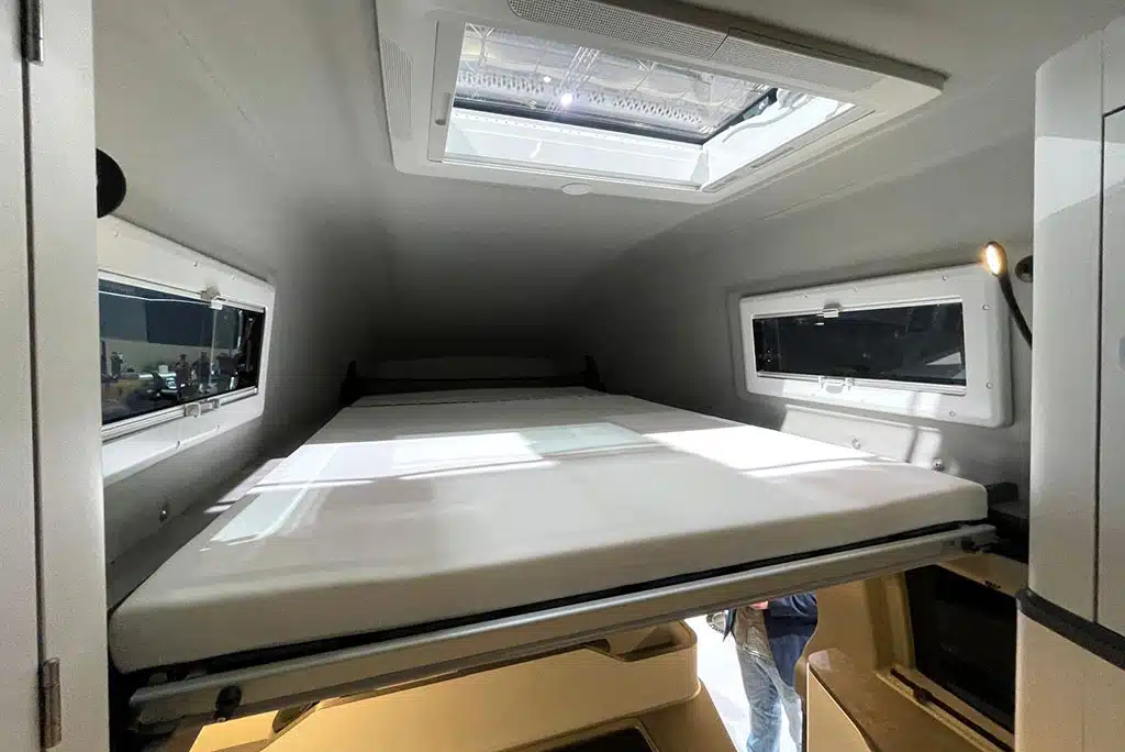 Das Dachbett misst 2,05 Meter in der Länge und 1,30 Meter in der Breite und ist damit fünf Zentimeter breiter als bei den Versionen mit Aufstelldach. Wird es nicht genutzt, lässt es sich nach oben klappen, sodass im Innenraum eine Stehhöhe von 2,09 Metern entsteht. Neu ist dabei die Bettmechanik: Statt des bisherigen Klapp- und Schiebemechanismus kommen nun Gasdruckdämpfer zum Einsatz – ähnlich wie beim Aufstelldach.