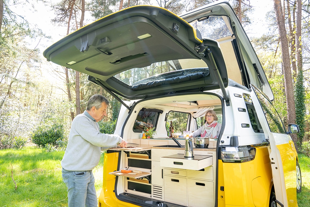 Ein Novum für den elektrisch angetriebenen VW: Der neue Ausbau eVentje für den VW ID. Buzz samt Aufstelldach, das Stehhöhe generiert, ein Panoramadach und zwei zusätzliche Schlafplätze bietet.
