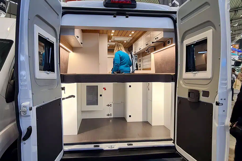 Im Heck befindet sich ein festes Querbett (192 × 140 cm). Zwei Schwanenhals-LED-Leuchten dienen hier als Leselicht, indirekte Beleuchtung ergänzt die Grundausleuchtung. Zwei Dachfenster bringen Tageslicht und Sicht auf den Sternenhimmel bei Nacht.