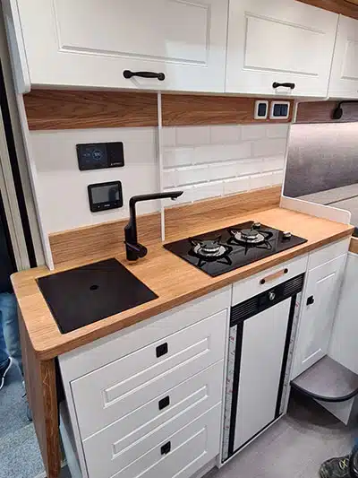 Auch beim Möbeldesign wählt Freedo eine ungewöhnliche Richtung: Die klassisch links neben der Schiebetür angeordnete Küchenzeile mit weißen Kassettenfronten und rustikalen Griffen ist ganz im Landhausstil gehalten. Neben dem zweiflammigen Kochfeld gibt es ein Edelstahl-Spülbecken mit mattschwarzer Armatur sowie einen beidseitig öffnenden 70-Liter-Kühlschrank. Eine ausklappbare Holzplatte erweitert die Arbeitsfläche.