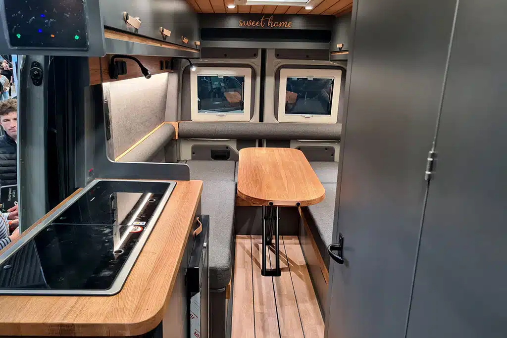 Praktisch: Der Tisch lässt sich in einem speziell dafür vorgesehenen Bodenfach versenken. Außerdem kann ein Teil des Mobiliars nach oben geklappt werden, wodurch der Heckbereich dann somit auch als Stauraum nutzbar. Sogar Fahrräder können dann (mit abmontiertem Vorderrad) im Fahrzeug mitgenommen werden.