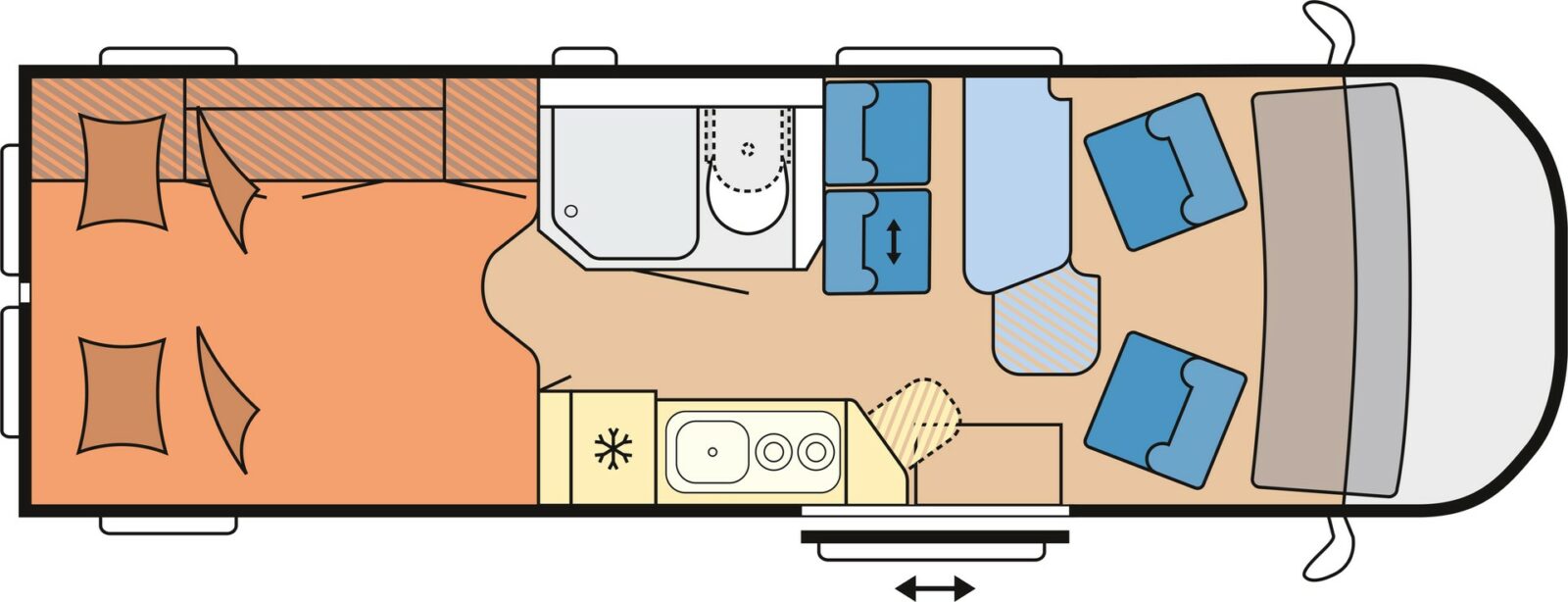 Mit einer zulässigen Gesamtmasse von 3,5 Tonnen und zwei Einzelbetten im Heck ist der MAXIA VAN ganz auf die Bedürfnisse von Paaren zugeschnitten. Ebenso an Bord: eine hochwertig eingerichtete Küche mit Kocher-Spüle-Kombination und 90 L Kompressorkühlschrank sowie ein Waschraum.  Seitenwände und Himmel in grauer Filzoptik sowie die Ambientebeleuchtung sorgen für eine gemütliche Atmosphäre.