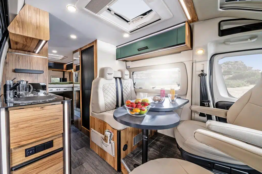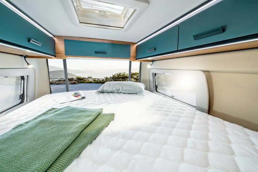 Charakterprägendes Merkmal ist das elektrische Hubbett im Heck, das über die gesamte Innenbreite reicht und somit komfortable Abmessungen von 185 mal 193 Zentimeter ermöglicht. Bis unter die Dachstauschränke angehoben, lässt sich die Größe der Heckgarage flexibel an den Stauraum-Bedarf anpassen.