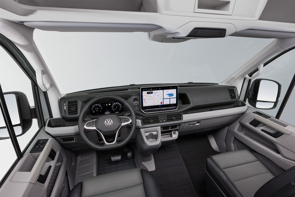 Im Cockpit des neuen Crafter finden sich digitale Instrumente, ein neues Infotainmentsystem mit freistehendem Touchscreen und verschiedene Assistenzsysteme.
