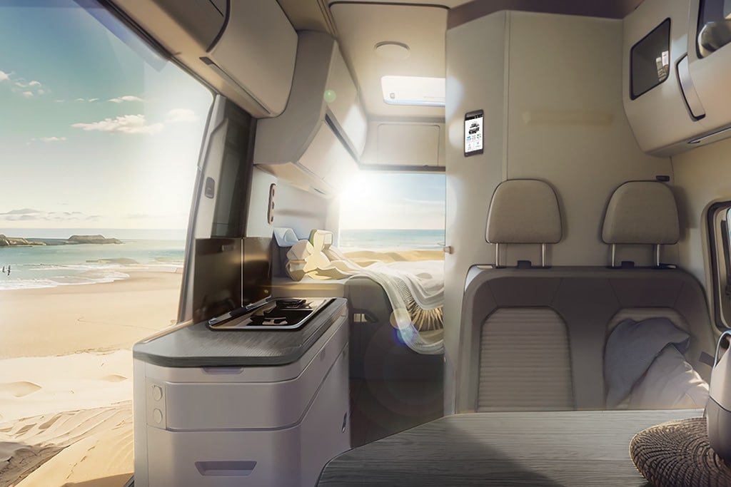 Erstmals lässt sich der mobile Esstisch auch außen am Küchenblock einhängen. Neu sind außerdem Gepäcknetze in den Oberschränken, die das Verstauen von Kleidung und Reiseutensilien erleichtern. Optional bietet VW für das Fahrerhaus ein Thermomatten- und Verdunkelungs-Set an, das eine Verdunkelungsoption mit Wärme- und Kälteschutz bietet.