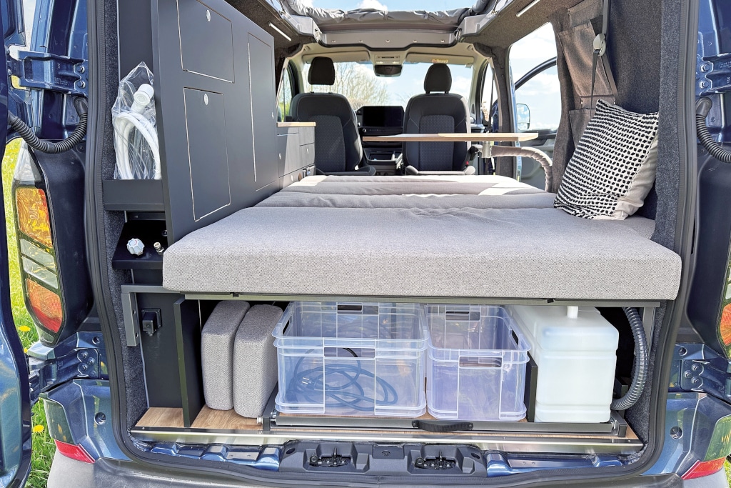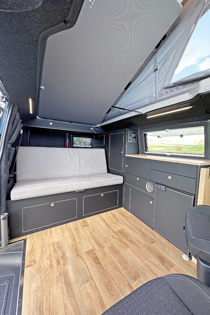 Für die nötige Autarkie sorgen zweimal 20-Liter-Frischwasser auf dem Auszug im Heck, 2,8 Kilogramm Gas zum Kochen, ein 15-Liter-Abwassertank, ein 45-Liter-Kompressor-Kühlschrank und die 92-Ah-AGM-Batterie. Die elektrische Ausstattung lässt sich natürlich noch nach eigenen Wünschen aufrüsten mit Lithium-Batterien und Solar-Anlage.