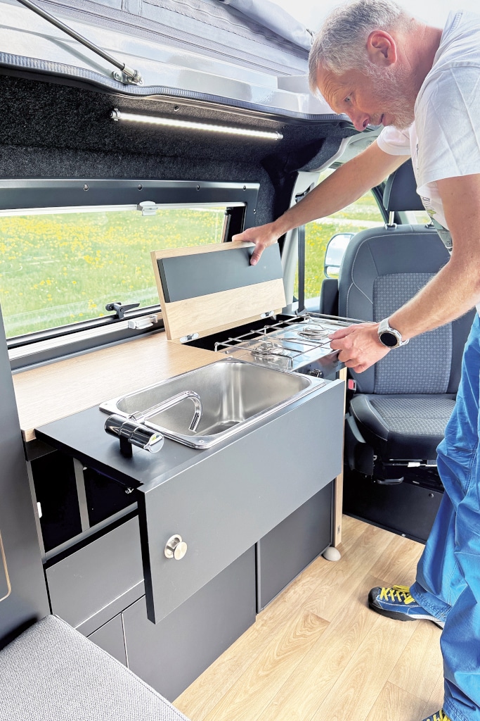 Das bedeutet, der Ford ist nicht breiter, dennoch hat man innen mehr Platz als bisher. Der Grundriss ist prinzipiell wie beim 4.9 nur mit besserem Platzgefühl. Das bisschen mehr Platz wurde vom Werz-Team gleich optimal genutzt und der Küchenblock wurde umkonstruiert.