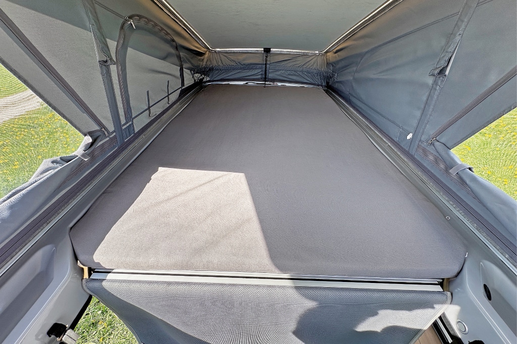 Ebenfalls sehr bequem schläft es sich im SCA-Aufstelldach mit Kunststoff-Tellerfedern und großem Bett. Besonders im Sommer ist es oben luftig und gemütlich mit dem großen Mosquito-Netz.