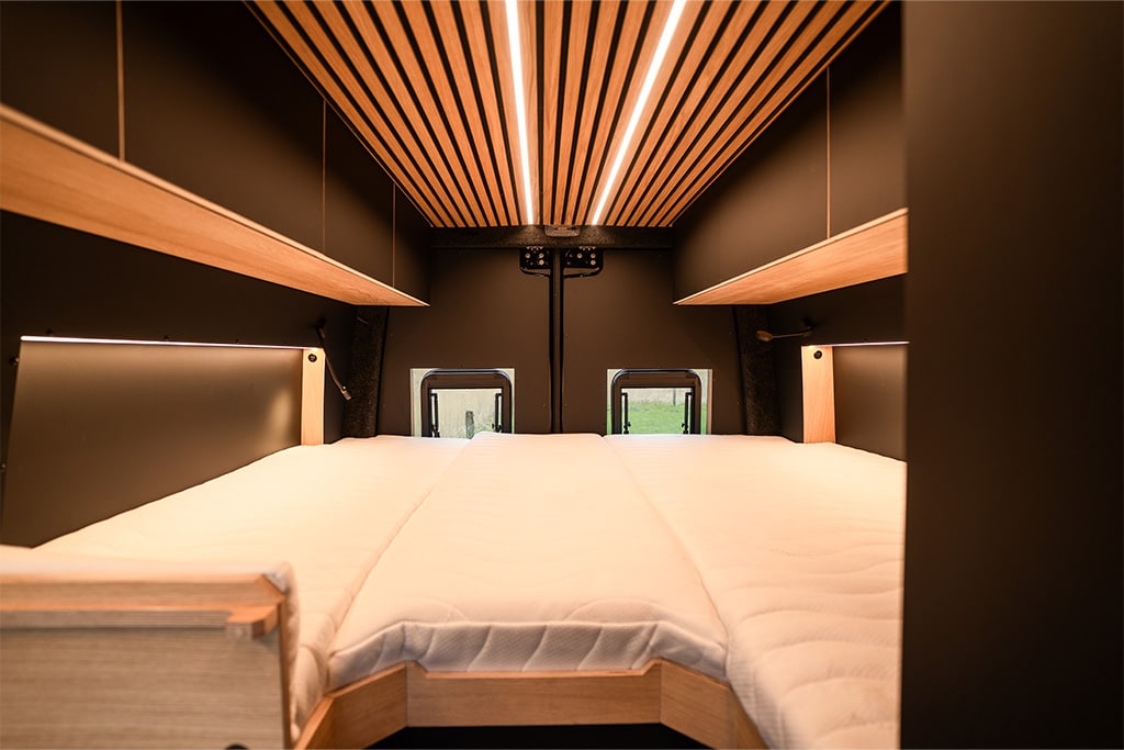 Als Ausbauhersteller für Volkswagen und Mercedes-Benz bietet die Hamburger Firma Lösungen mit hohen Qualitätsstandards. Mit der neuen Variante des Sprinter-Ausbaus verzichtet der Hersteller auf die Sitzbank und schafft zusätzlichen Schlafkomfort.