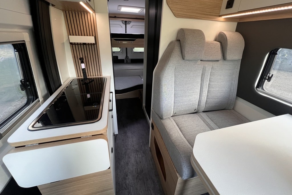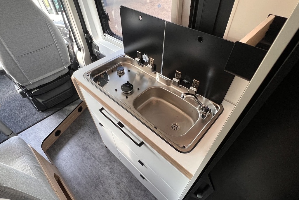 Der Küchenblock, wie gewohnt direkt links von der Schiebetür, besteht aus einem massiven Korpus mit ausklappbarer Arbeitsflächen-Erweiterung. Mittig eingelassen finden wir die Spüle-Kocher-Einheit mit zwei Flammen, elektrischer Zündung und integriertem Hebelmischer. Die Abdeckungen sind aus Glas. Über der Küche thronen Oberschränke, rechts an der Schrankwand Richtung Kühlschrank findet man eine kleine Ablage für Spülmittel & Co. Der große Kompressorkühlschrank ist nun Serie.