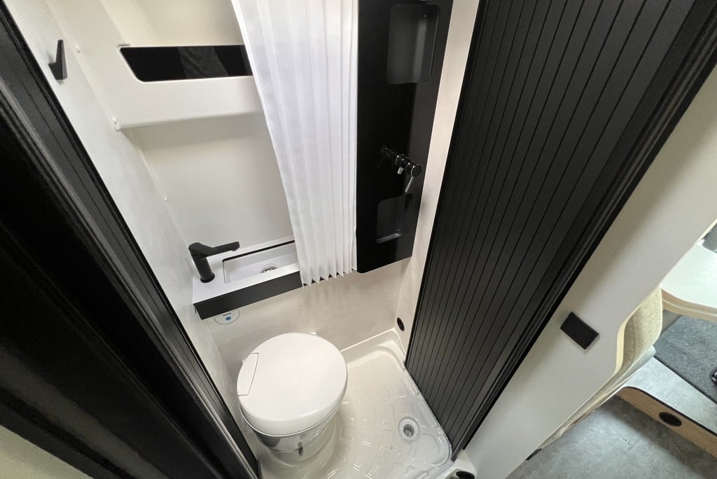 Das Bad in Wagenmitte links verfügt über eine Kunststoff-Duschwanne und eine Thetford-Drehtoilette. Über der Toilette finden wir ein sehr schmales Handwaschbecken, weiter oben ist noch eine kleine offene Ablage ins Kunststoff-Formteil integriert. Diese Ablage lässt sich beim Duschen mit einem Vorhang vor Spritzwasser schützen. Das Bad selbst wirkt durch schwarze Akzente und schwarze Armaturen besonders elegant.