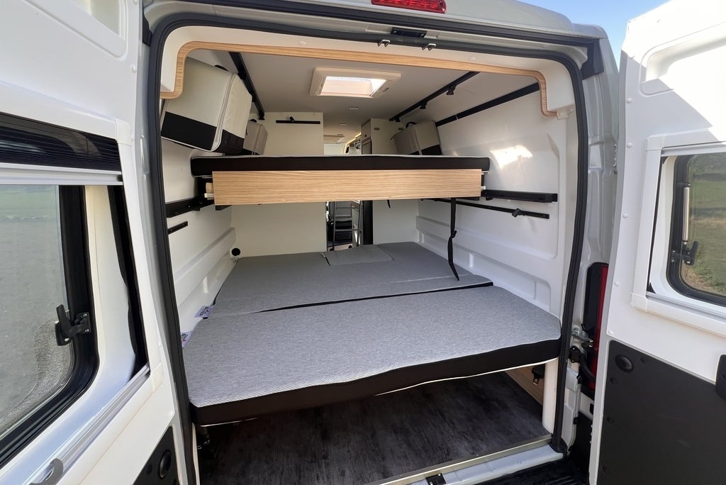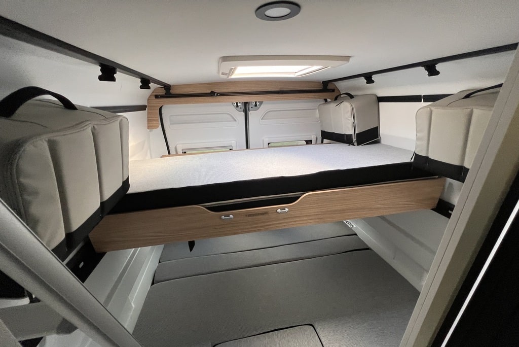 Möchte man diesen Stauraum erweitern, kann man das 1,71 x 1,85 Meter große obere Bett ebenfalls halbieren. Dafür muss man zuerst die – quer angeordneten – Matratzen aufeinanderstapeln, dann kann man den hinteren Lattenrost unter den vorderen schieben. So entsteht ein 85 x 185 Zentimeter großes Bett, das man in seitlichen Schienen verschieben kann. Dadurch kann der Heckstauraum maximiert werden. Im Boden der Heckgarage sind Verzurrösen zur Befestigung von großem Gepäck, Sportgeräten und ähnlichem vorhanden.