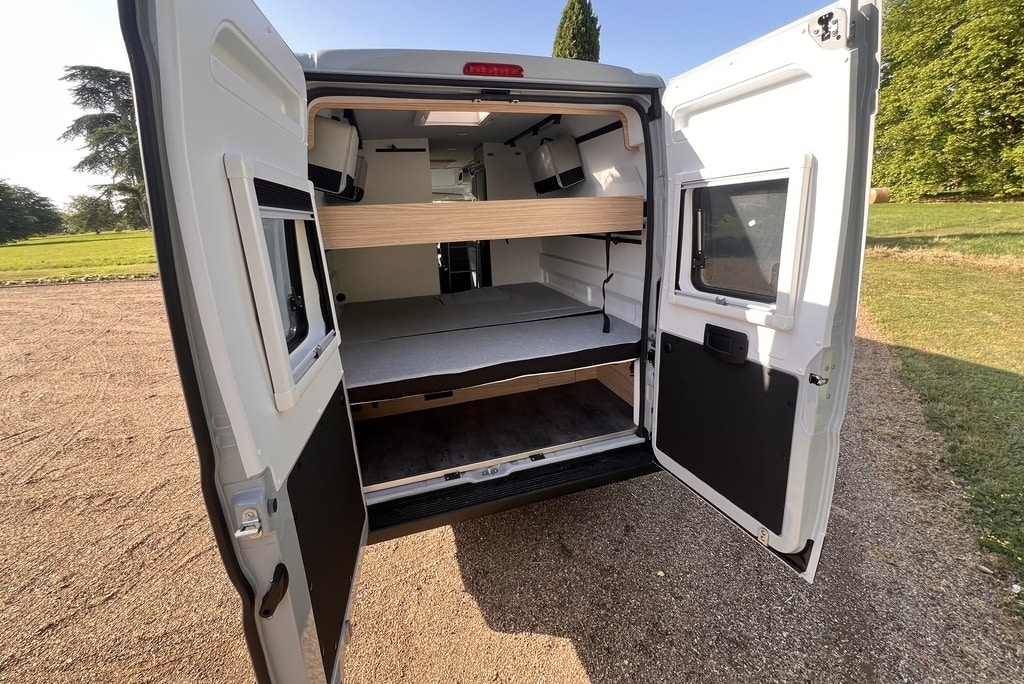 Das größte Highlight im Pilote 630 S sind die übereinander platzierten Doppelbetten im Heck. Die untere, 1,84 x 1,98 Meter große Liegefläche lädt dabei zum Längs- oder Querschlafen ein. Die Matratzen sind quer angeordnet. Die hintere Hälfte lässt sich nach oben klappen und mit zwei Spanngurten, ähnlich den Sicherheitsgurten im Auto, in der oberen Stellung arretieren. So entsteht im Heck, unter dem oberen Bett, ein großer Stauraum.