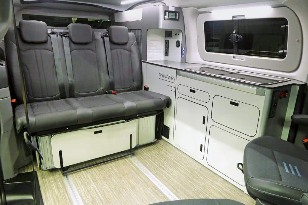 Unter der Sitzbank und in der Seitentasche findet sich zusätzlicher Stauraum. Außerdem praktisch: die große Arbeitsplatte, ein Ablagetisch an der Heckklappe und ein digitales Steuergerät.