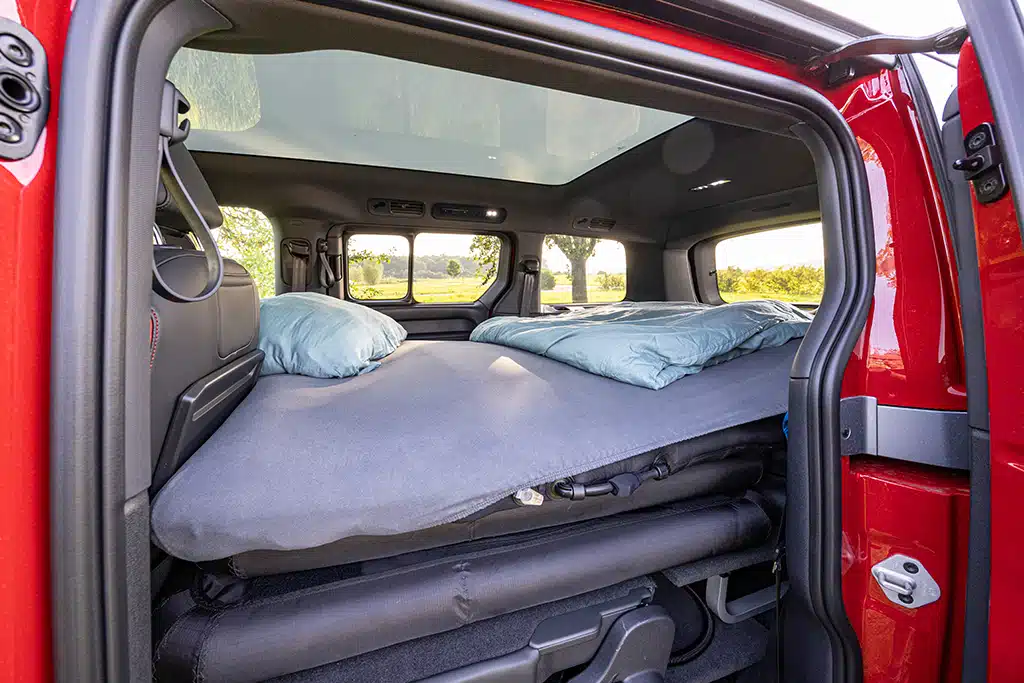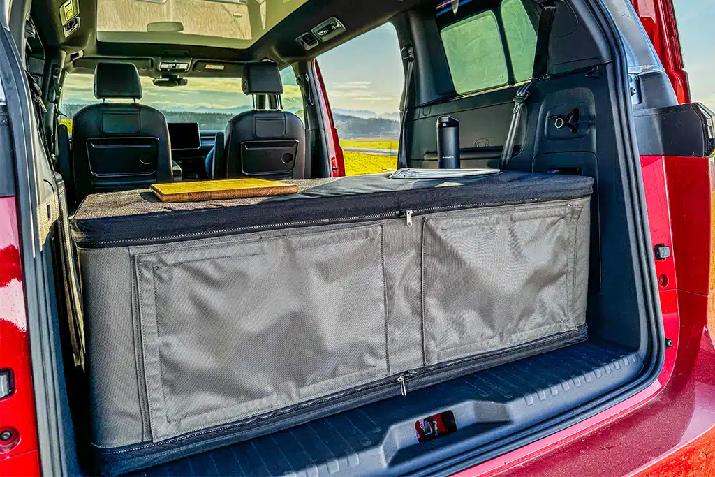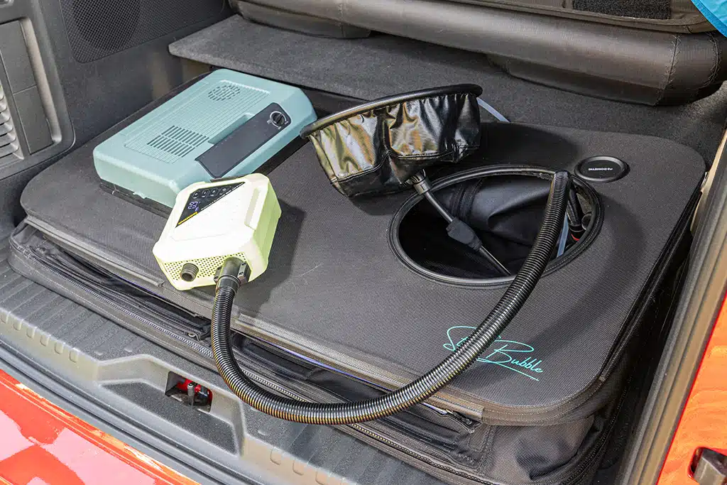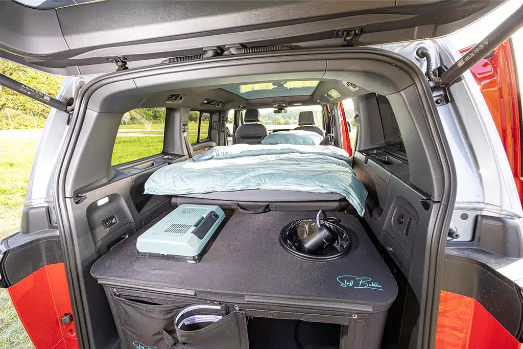 Selbst ein aufblasbarer Kühlschrank ist in Zusammenarbeit mit Dometic, exklusiv für Stuff Bubble, entstanden – Luft isoliert ja bekanntlich ganz ordentlich. Ein mobiler Kocher rundet die Küchenausstattung ab. Ansonsten gibt es clevere Magnet-Seilzug-Schiebetüren, natürlich auch aus einem Robusten Stoff gefertigt – macht acht Kilogramm in der Light-Version und soll ab 1.250 Euro zu haben sein.