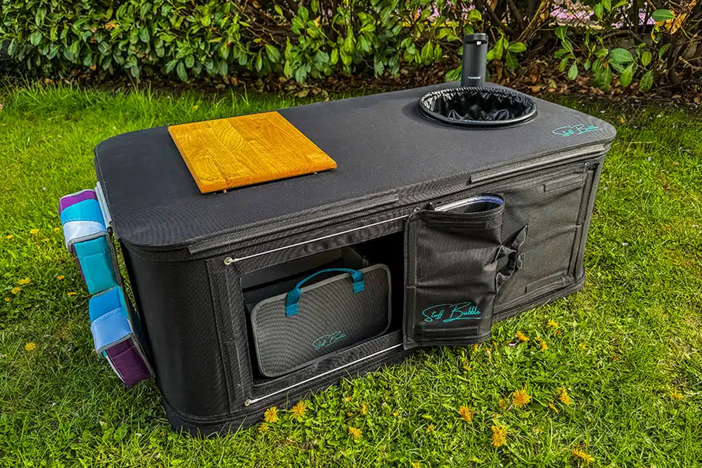 Aufgepumpt ist die Küche dann 46 Zentimeter hoch. Laut Hersteller handelt es sich um die leichteste, vollfunktionsfähige Küche im Campingbereich. Sie ist ausgestattet mit einem elektrischen Wasserkreislauf inklusive Frisch- und Abwasser-Blase, Faltwaschbecken sowie der Akku-Armatur Dometic Go Hydration.