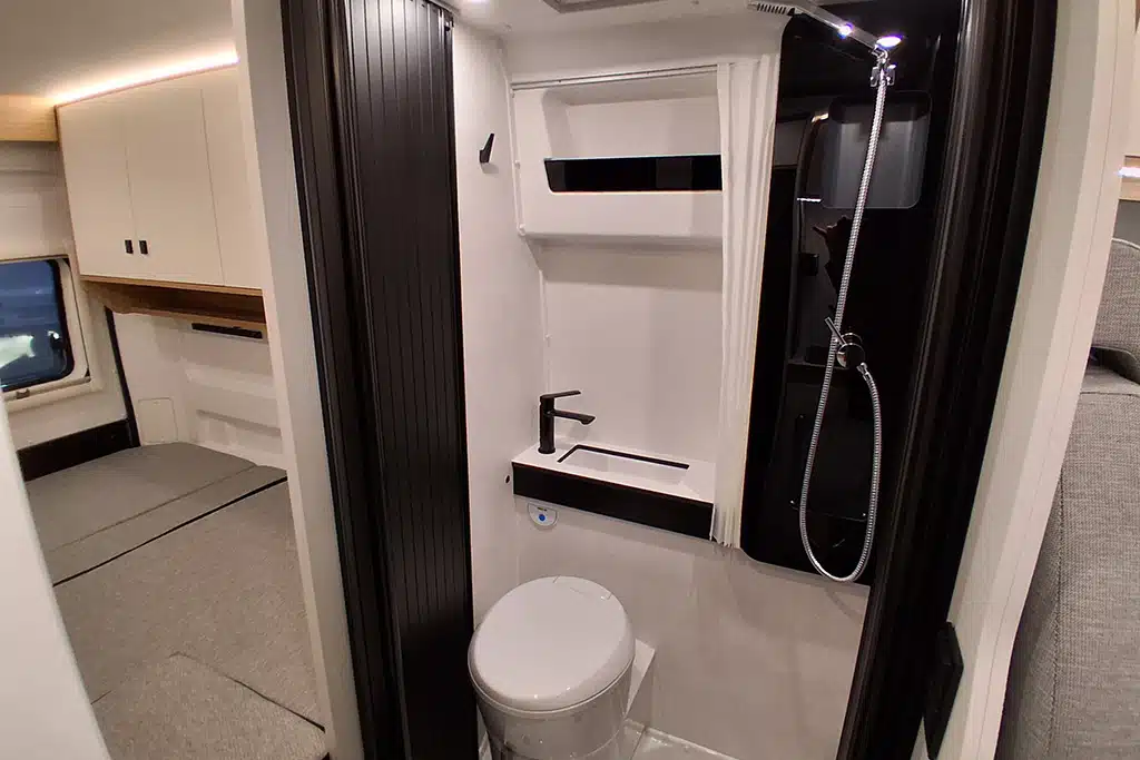 Die Nasszelle jenseits des Mittelgangs mit Drehtoilette von Thetford und integrierter Dusche betritt der Urlauber nach Öffnen zweier Kunststoff-Gliedertüren. Vor dem Abbrausen deckt man das Waschbecken in einer Nische mit einem wasserfesten Plissee ab. Als Option bietet Pilote ein Badfenster an.