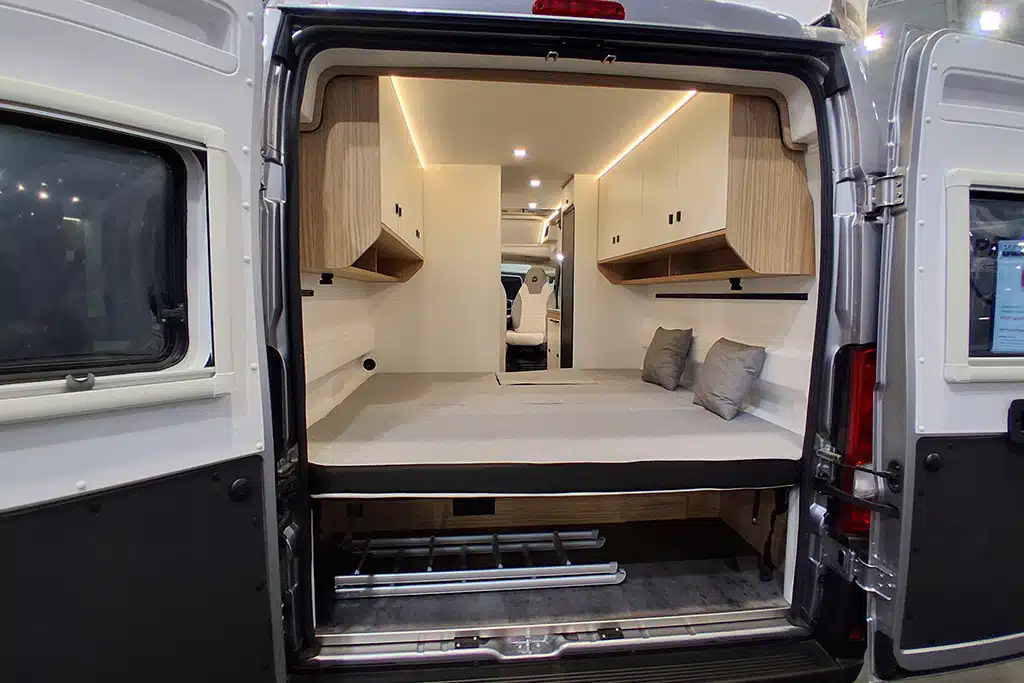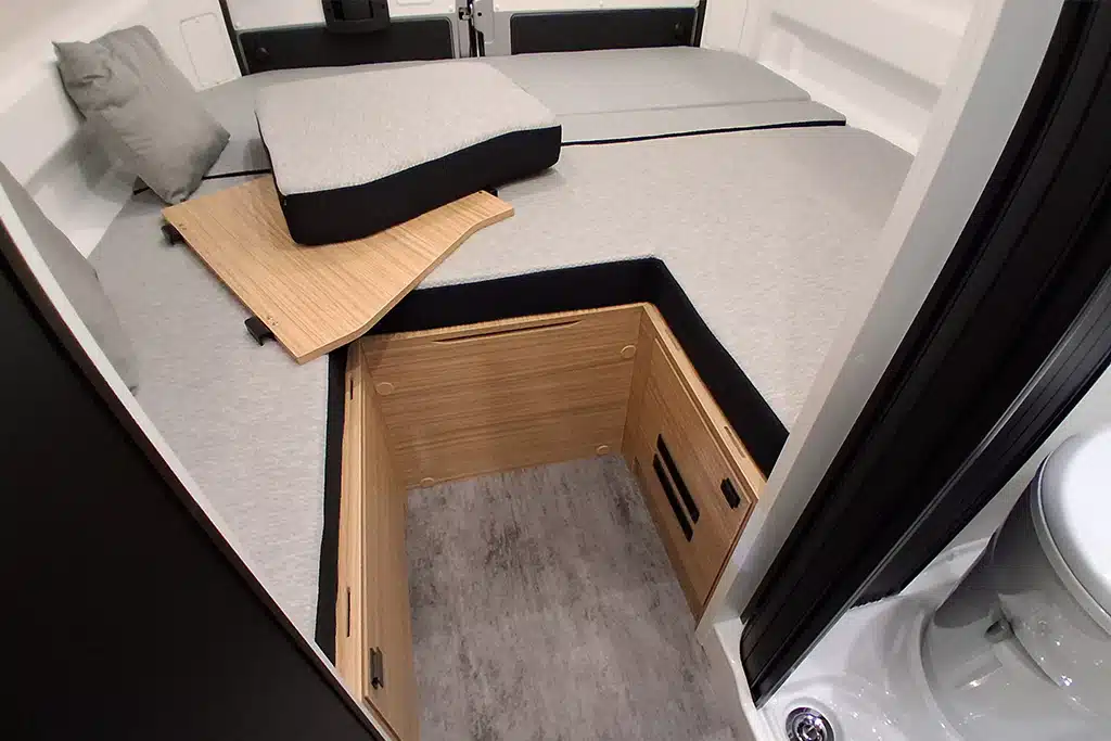 Vor den beiden Heck-Flügeltüren offeriert der Pilote V630B Spring Edition ein Längs-Doppelbett, dessen Kopfende sich aufstellen lässt. So erweitert sich der Heckstauraum darunter bis unter das Dach und unter die ungewöhnlich großen Oberschränke im Schlafabteil.