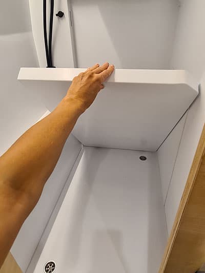 Zum Duschen wird die obere Platte des Bodens im Bad einfach hochgekippt.