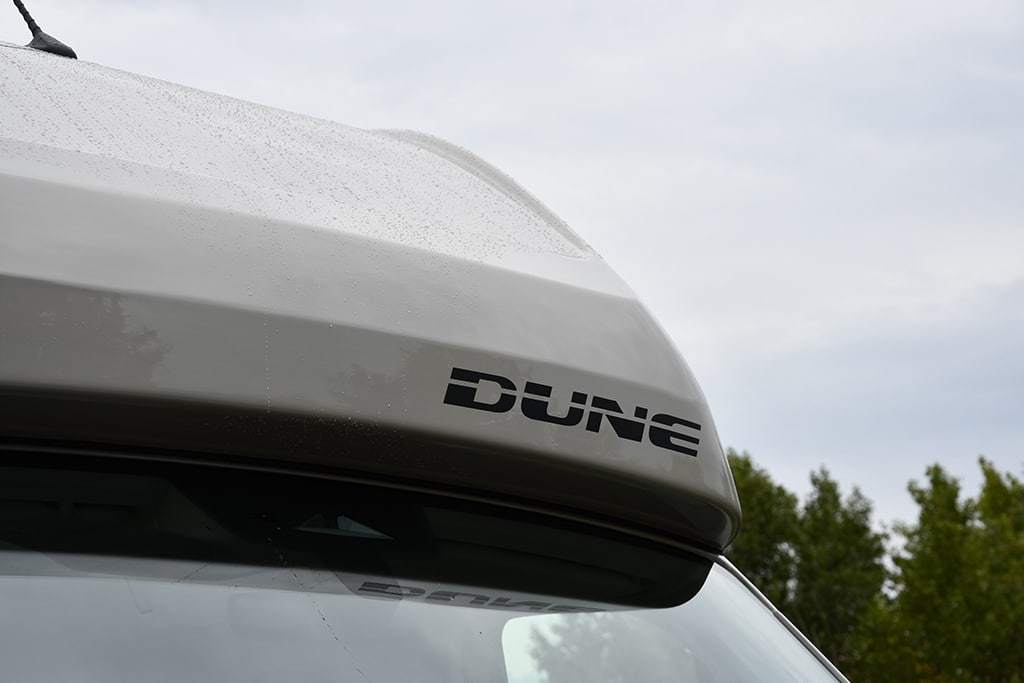 Das Sondermodell Grand California Dune gibt sich an einer Uni-Lackierung in Ascotgrau, schwarzen 17-Zoll-Alus und einer Folierung mit dem Schriftzug „DUNE“ plus Kompass in der seitlichen Fensterlinie zu erkennen. Die Farbe – ein heller Kreideton – war bereits auf dem T6.1 beliebt und bisher nicht für den Grand California auf VW Crafter erhältlich.
