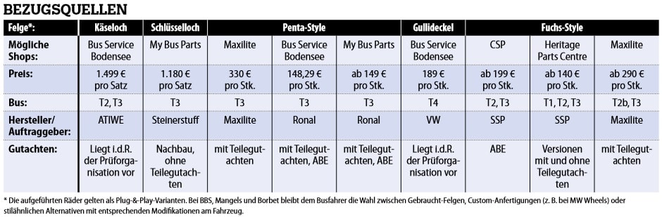 Die Details eines schnell rotierenden Körpers vermag das menschliche Auge kaum zu vernehmen, die eines ruhenden schon – insbesondere wenn er sich gleich in vierfacher Ausführung an einem Bulli befindet. Und wenn das Augenpaar einem geneigten Enthusiasten gehört! Die Rede ist von Felgen. Genauer gesagt von solchen, die in der Bulli-Szene seit Jahren besonderen Anklang finden. Während moderne Bus-Modelle zwar ebenfalls recht ansehnliche Exemplare dieser Art auf dem Asphalt-Boulevard präsentieren, lassen sich besonders an den ersten vier Bulli-Generationen echte Charaktere mit internationaler Tragweite ausmachen.