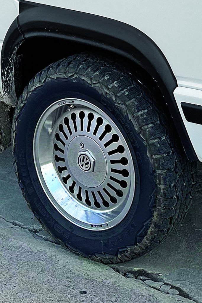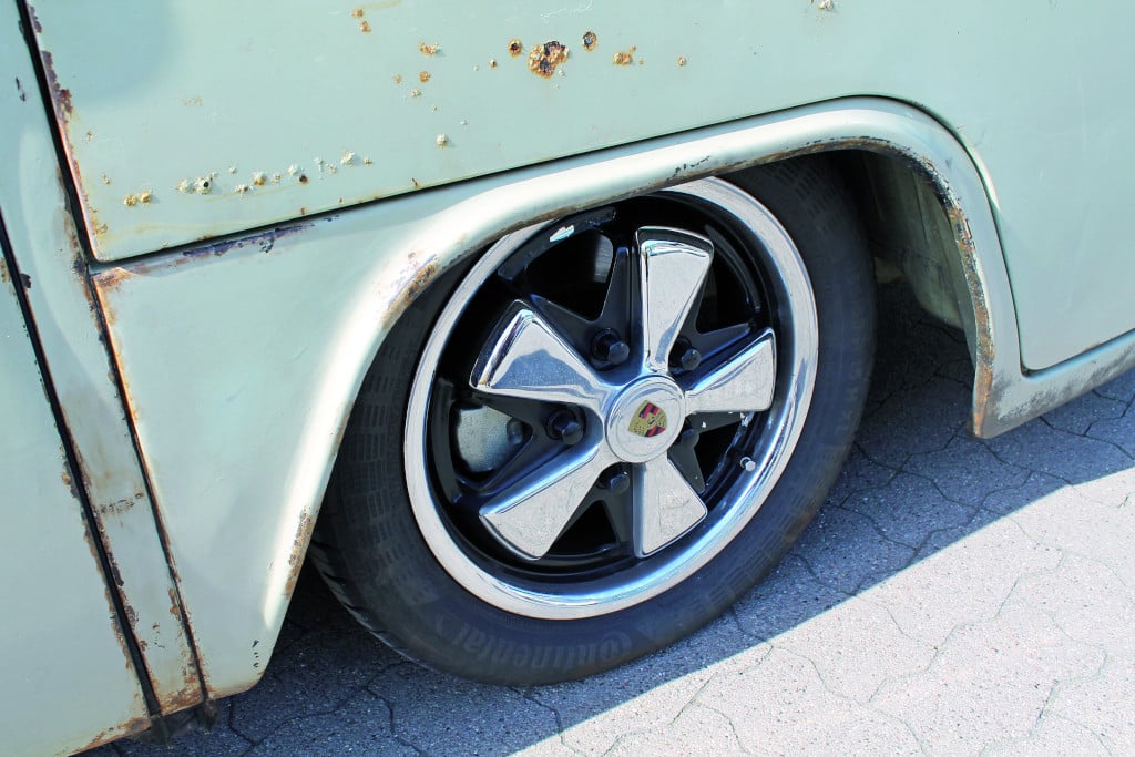 Was dem Porsche steht, ist gerade gut genug für den Bulli: die Fuchs-Felge im Flügelrad-Design, hier teilpoliert.