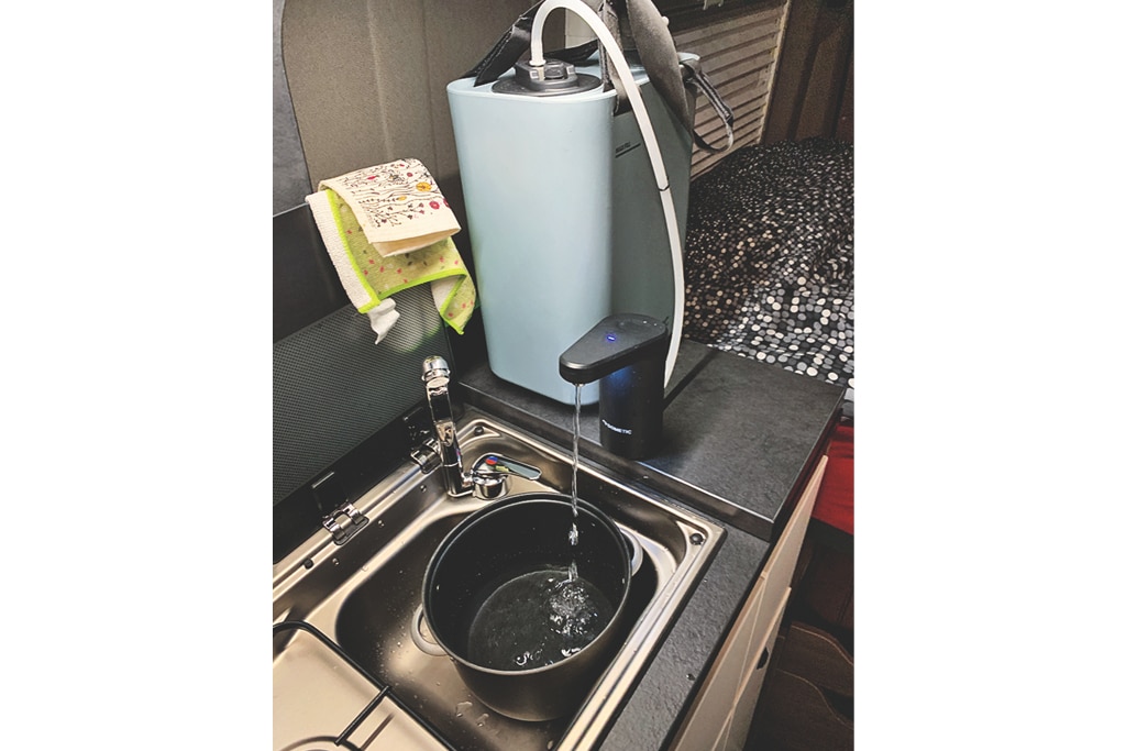 Gut, wer’s komfortabler wünscht, und parallel den E-Wasserhahn, den Dometic Go Faucet geordert hat, der wird oben in einem der beiden Deckel eingesteckt und über einen schnellen Zweifach-Fingertipp angeschaltet, ein Fingertipp solo stoppt den Wasserfluss (er ersetzt nun den defekten Ausgießer). Eine unten platzierte LED leuchtet aufs Geschehen, sprich auf Tasse oder Topf. Sehr schön gelöst.