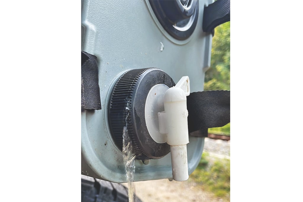 Das Set besteht aus einem 11-Liter-Kanister und einem Wasserhahn samt integriertem Akku. Den braucht’s nicht einmal: Wer den Dometic Go Jug (Kanister) solo kauft, erhält einen drehbaren Wasserhahn für eine der beiden Öffnungen im Deckel und kann den Kanister auch einzeln verwenden. Im zweiten Deckel lässt sich ein Ventil öffnen, so kann Luft angesaugt und das flotte Ausgießen, sprich die Strömungsgeschwindigkeit optimiert werden. Das funktioniert prima.
