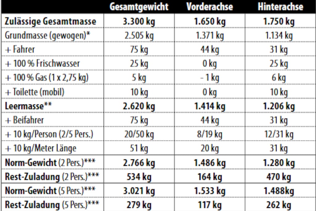 Bevor wir nun die Familie losschicken, haben wir das Fahrzeuggewicht noch einmal genauer betrachtet: Dass da noch massig Luft ist, steht in der Ladetabelle.